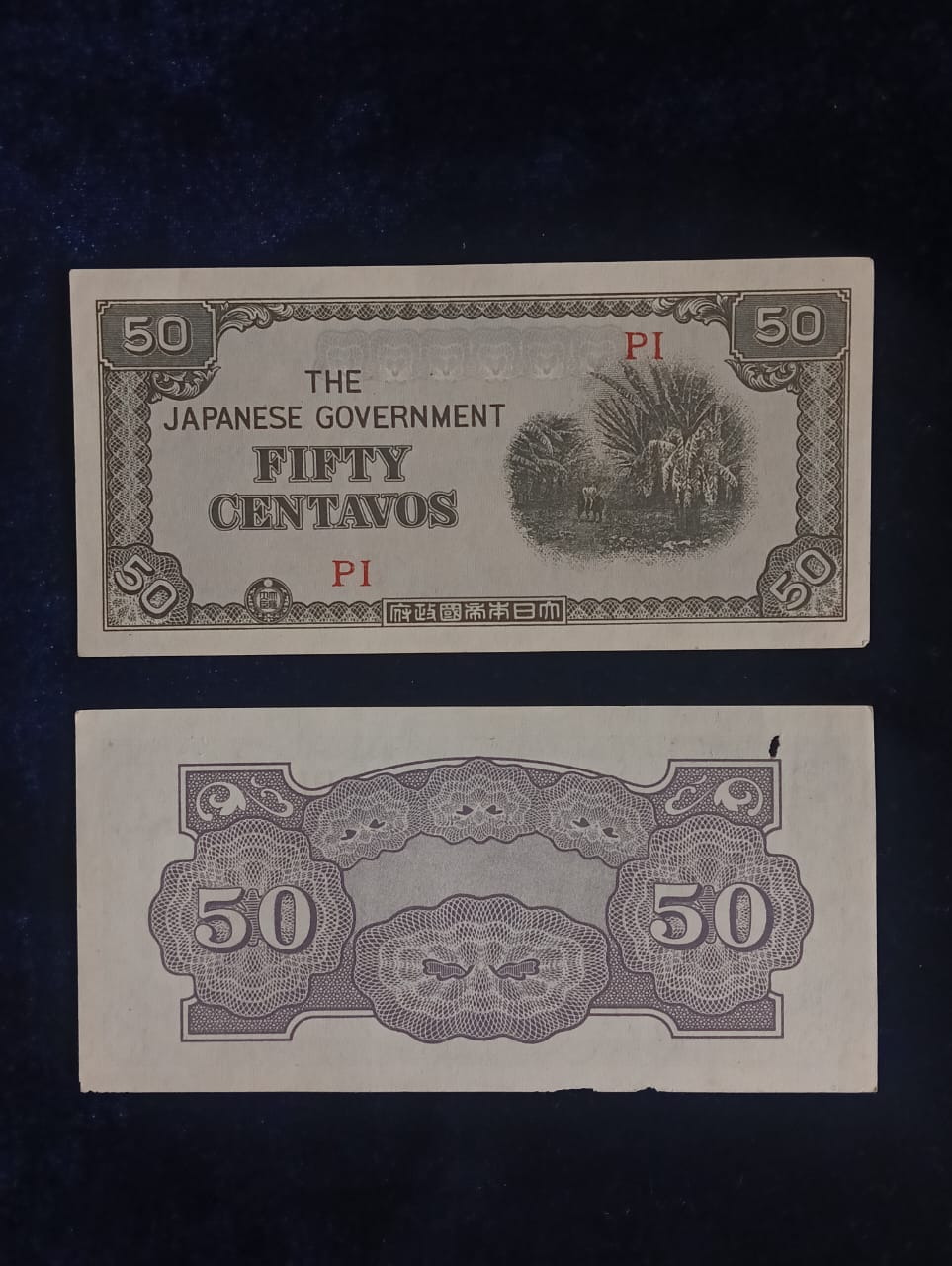 The 50 Centavos banknote was issued in 1942 by the Japanese Government during the occupation of Philippines in World War II. After Japanese forces took control of the islands, new currency was introduced to replace the existing monetary system. These notes were printed in large quantities to maintain economic activity under military administration.